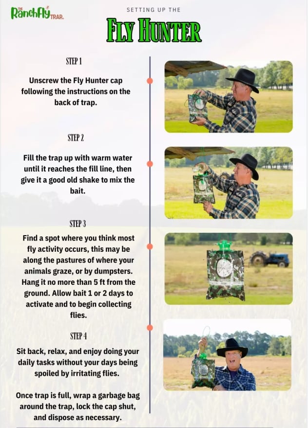 The Fly Hunter puts an end to this constant irritation with its irresistible bait formula. Flies ignore your animals and head for the trap, like moths to a flame.